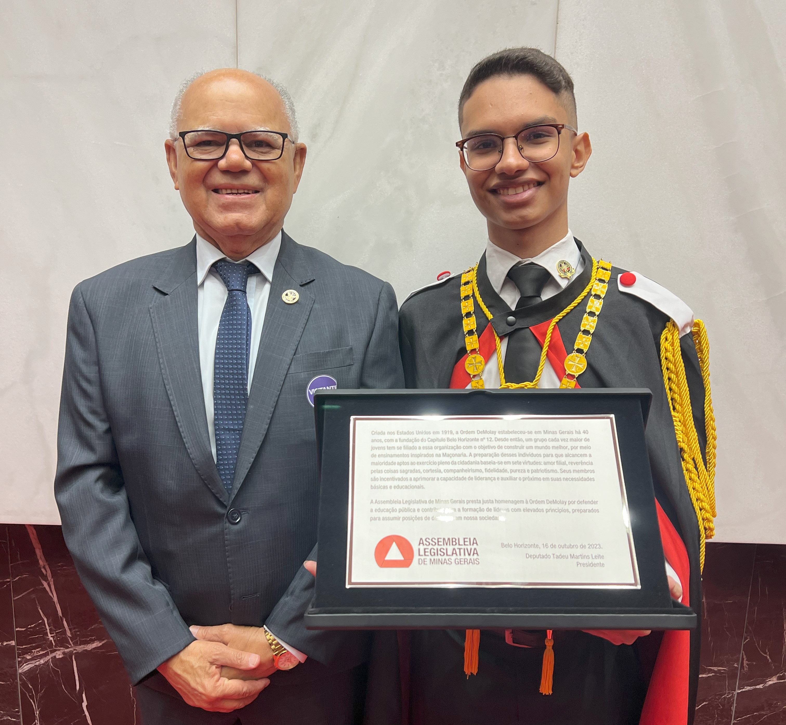 Reunião Especial da Assembleia Legislativa Homenageia a Ordem DeMolay por seus 40 Anos de Atividade em Minas Gerais. No dia 16 de outubro de 2023, a Assembleia Legislativa do Estado de Minas Gerais realizou uma reunião especial em homenagem à Ordem DeMolay pelos seus 40 anos de trabalho dedicado em Minas Gerais, marcando este momento especial com a fundação do Capítulo Belo Horizonte nº 12 da Ordem DeMolay.